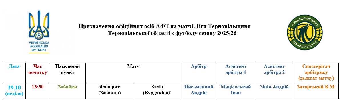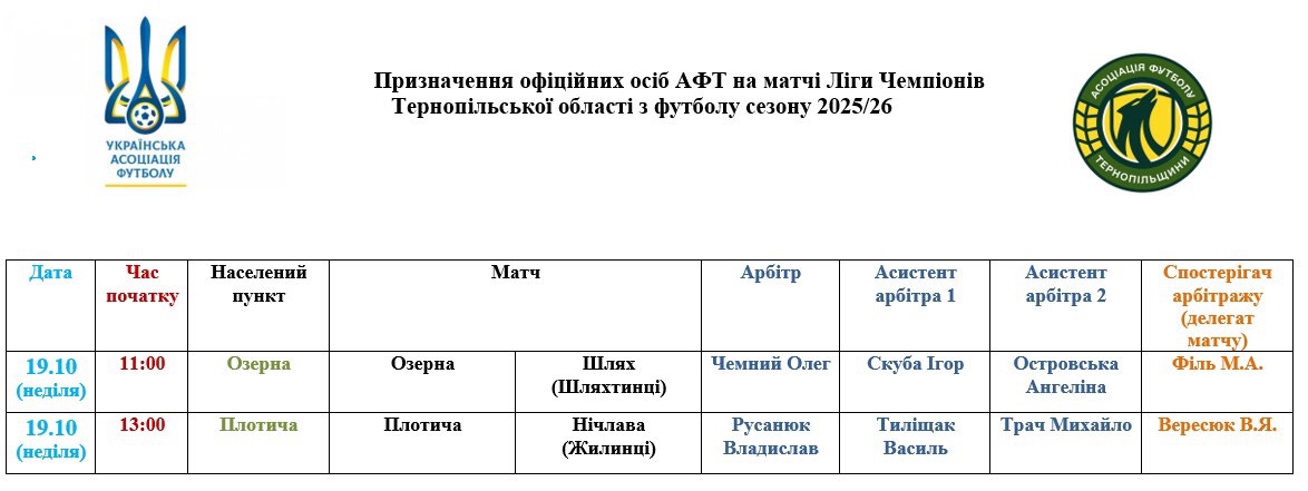 Призначення офіційних осіб АФТ на матчі Ліги чемпіонів та Ліги Тернопільщини Асоціація футболу Тернопільщини 18.10.2025