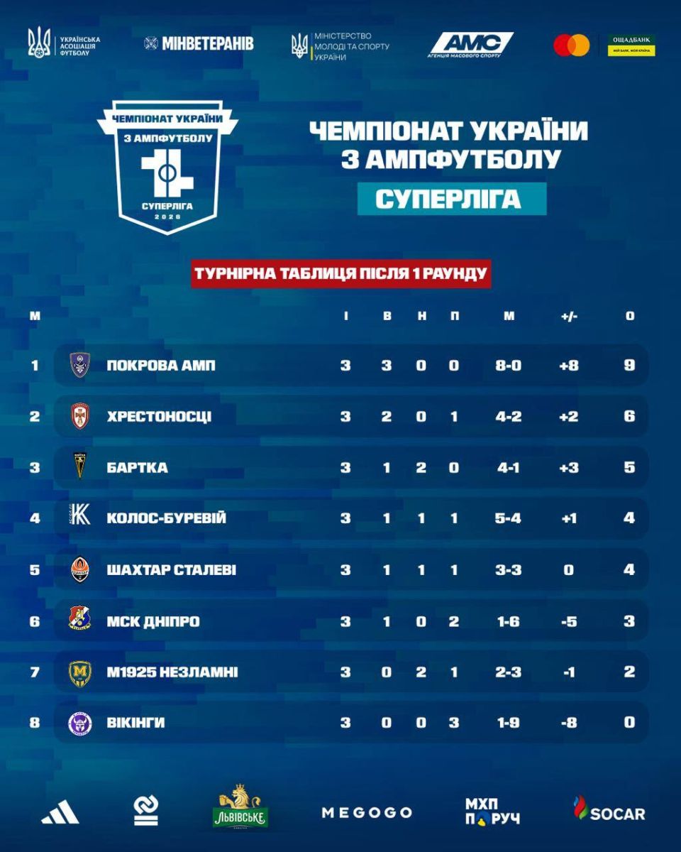 Після трьох турів лідером Суперліги є «Покрова АМП» зі Львова - чинний чемпіон підтвердив свій клас беззаперечними результатами. На другому місці - «Хрестоносці» з Луцька, і відстань між лідерами мінімальна. Третю сходинку займає «Бартка» з Івано-Франківська з пʼятьма очками. «Бартка» - чемпіон Першої ліги сезону-2025 - з першого раунду ввірвалась у лідери Суперліги, підтвердивши, що її зростання не випадкове. Далі з рівними показниками йдуть «Колос Буревій» та «Шахтар Сталеві». На шостій позиції - «МСК Дніпро» з трьома очками. «Металіст 1925 Незламні» - сьомі, на одне очко менше. Замикають таблицю тернопільські «Вікінги» - дебютанти Суперліги поки без залікових балів.